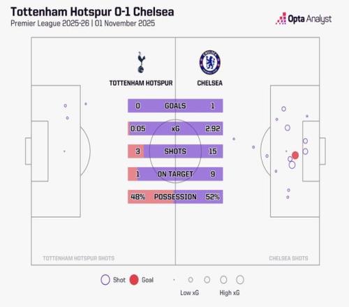此役主场对阵切尔西,热刺全场仅完成三次射门,预期进球值(xG)仅为0.05,这是自2012-13赛季有统计以来,热刺英超单场最低的预期进球值。