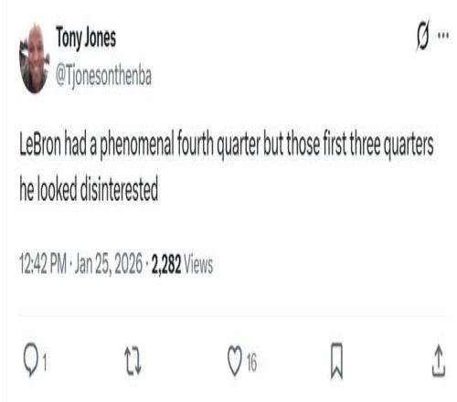 面对詹姆斯这样的表现,记者Tony Jones赛后精准评价道:“勒布朗在末节打出惊艳表现,但他在前三节看起来完全提不起兴趣。”