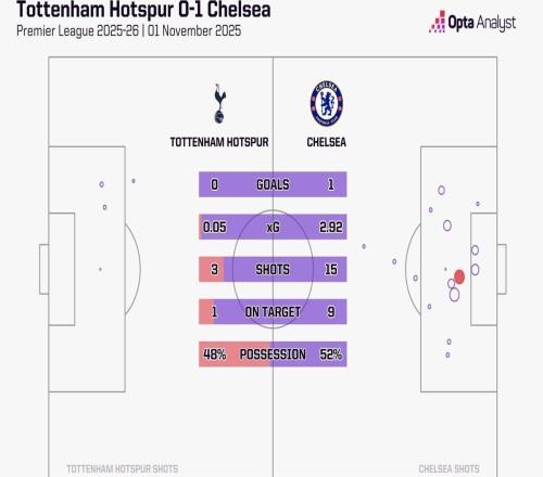 与切尔西一役预期进球仅0.05,为有统计以来热刺英超单场最低